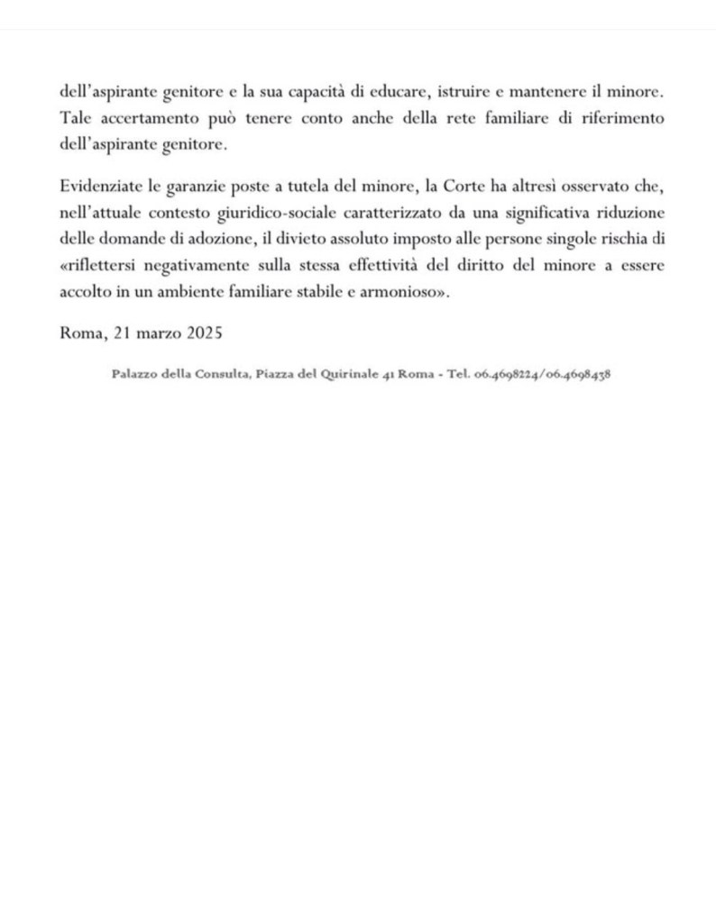 Uno storico SI’…la Corte Costituzionale ha dichiarato l’ incostituzionalità del divieto per i single di adottare un bambino residente all’estero. Condividi: Email a link to a friend (Si apre in una nuova finestra) E-mail Share on LinkedIn (Si apre in una nuova finestra) LinkedIn Mi piace Caricamento...